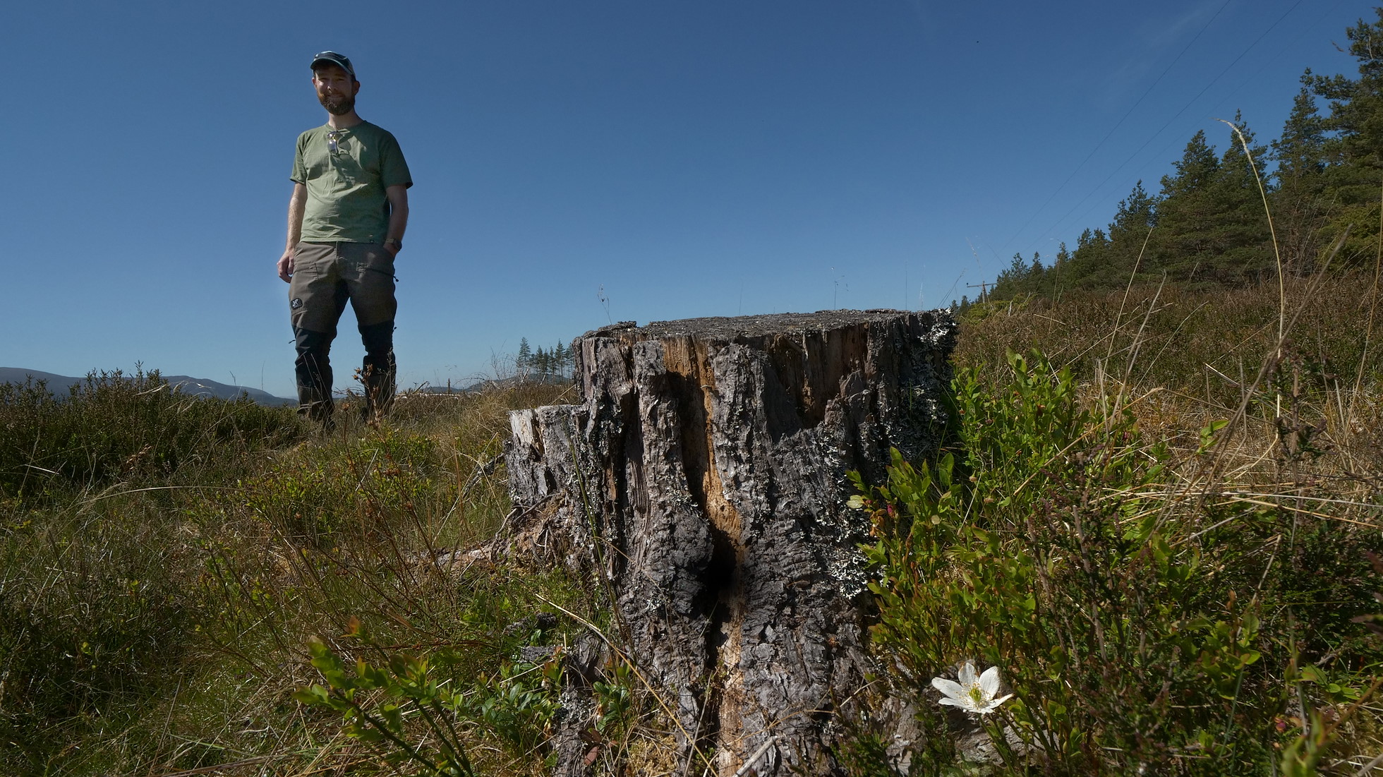 Now living in Stirlingshire with his growing young family, Duncan visits Moormore every three months, taking photographs from a series of fixed points to document the changes happening here. He is an accountant by training but has a naturalist’s eye for tiny details, and there is always something new to see. He stops regularly as we explore the site together, noticing a late wood anemone flower, a green orb spider and the song of a whinchat perched on top of a granny pine.